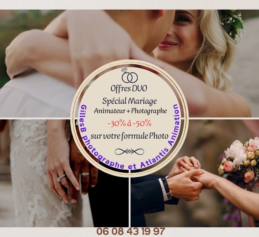 En tant que photographe et animateur de soirée, je propose une offre duo spécialement conçue pour le jour J des mariés. Cette formule unique présente trois avantages majeurs : tout d'abord, une réduction de prix significative qui allège le budget de votre événement. Ensuite, vous bénéficiez d'une meilleure organisation en n'ayant qu'un seul prestataire pour deux services essentiels, ce qui simplifie la planification. Enfin, pour rendre votre soirée encore plus mémorable, je vous offre un module photo gratuit( soirée) afin de capturer les moments forts de cette nuit inoubliable. Ensemble, nous créerons des souvenirs précieux tout en vous facilitant la vie le jour de votre mariage.